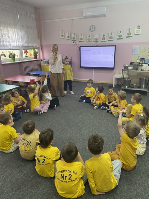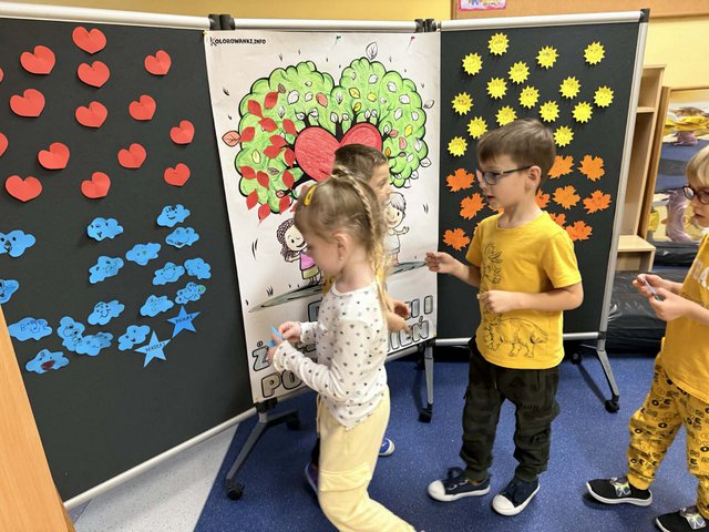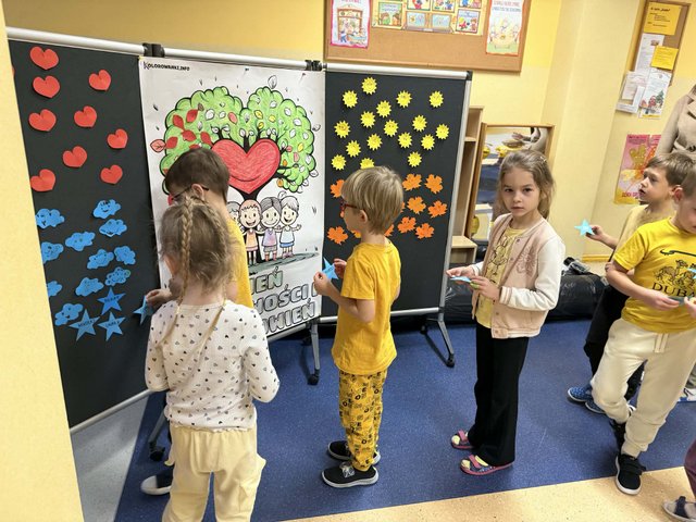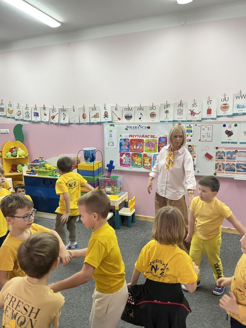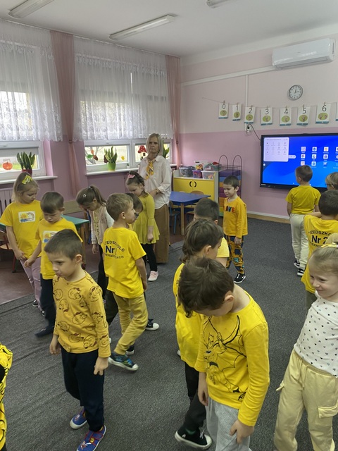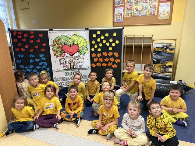 21 listopada obchodziliśmy Dzień Życzliwości i Pozdrowień, dzień dobrych uczynków i pozytywnych emocji. Tego dnia w naszej grupie dominował kolor żółty – kolor optymizmu i radości - wszystkie przedszkolaki miały na sobie żółte koszulki. W tym dniu dzieci między innymi, podawały cechy charakteru osoby życzliwej, szukały odpowiedzi na pytania: Czym jest życzliwość? Jak okazać ją na co dzień? mówiły sobie miłe, ciepłe słowa, obdarowywały się uśmiechem, uczestniczyły w zabawach koleżeńskich. Przedszkolaki przypomniały sobie ile w naszych codziennych relacjach znaczą proste słowa: proszę, przepraszam, dziękuję, dzień dobry, miłego dnia, a także jak cudowną i ciepłą atmosferę wprowadza serdeczny uśmiech na twarzy.