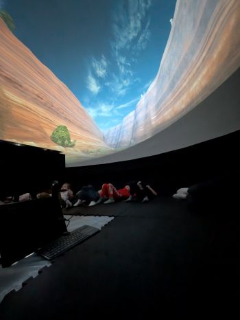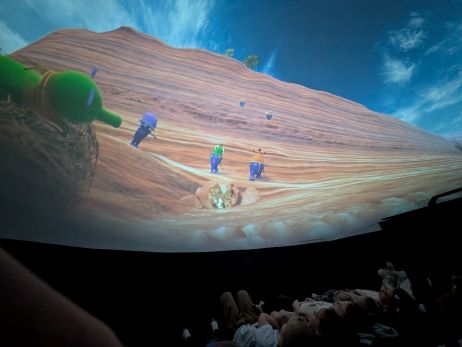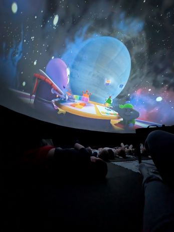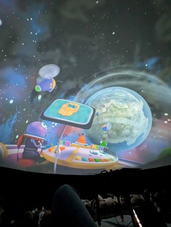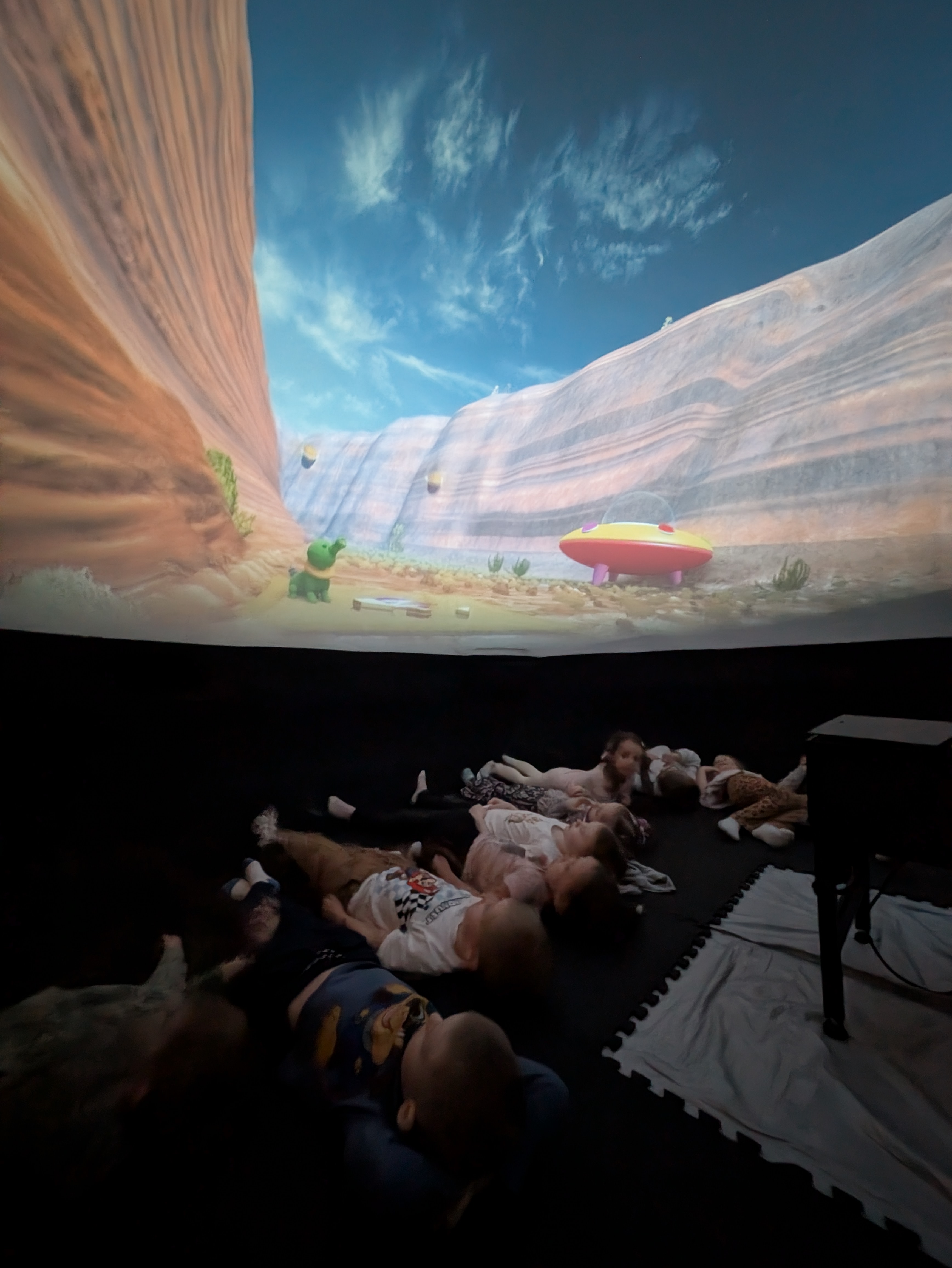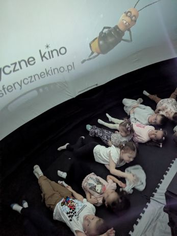 Kino sferyczne w przedszkolu to mobilne planetarium - nadmuchiwana kopuła, w której dzieci leżąc, oglądają film edukacyjny 306 °. To interaktywna nauka poprzez zabawę, angażująca zmysły i wyobraźnię, przedstawiająca kosmos, przyrodę czy naukę w realistyczny sposób. Seans w kopule to wspaniała atrakcja przybliżająca maluchom świat w przystępny sposób. Nasze przedszkolaki obejrzały film "Zula Patrol", który opowiadał o rutynowej wypraiey wykopaliskowej, gdzie Zula patrol odnajduje dowody na to, że nikczemna Deliria Delight cofnęła się w czasie na prehistoryczne ziemie po to, aby nielegalnie wyrzucić toksyczne śmieci spółki. Zula patrol musi ją odnaleźć i powstrzymać wcześniej, niż jej działania spowodują katastrofę ekologiczną. Przedszkolaki były zachwycone mobilnym planetarium i nowym sposobem zdobywania wiedzy.