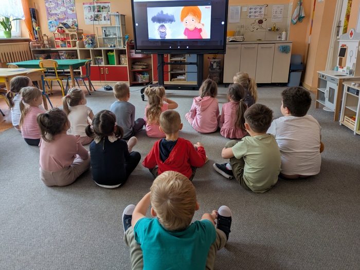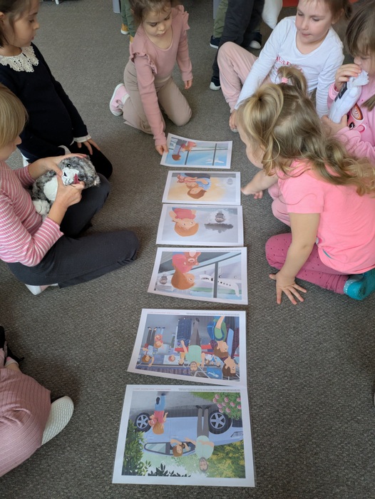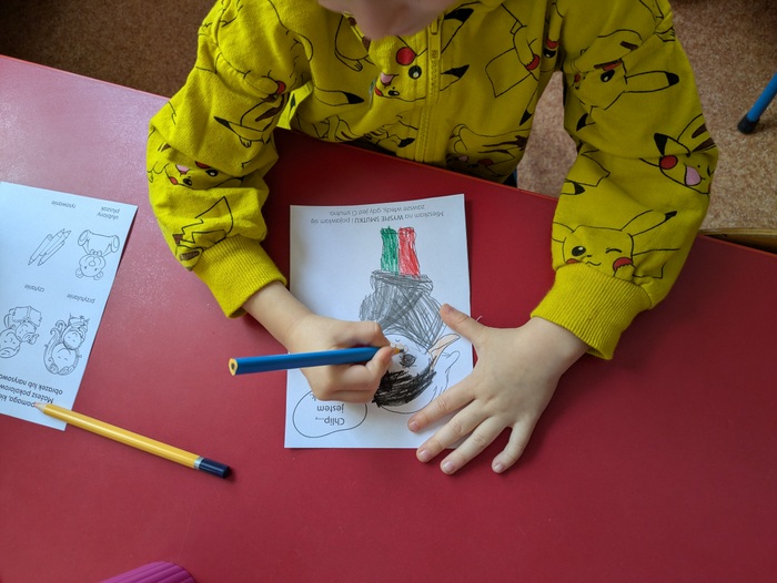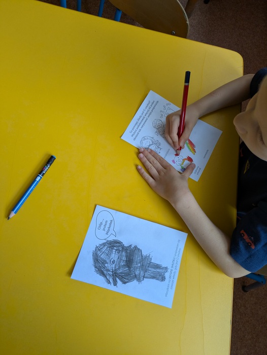 Dzisiaj poznaliśmy kolejnego bohatera z serii Czuciaki, był nim Markotek. Pojawia się zawsze, kiedy ogarnia kogoś smutek, w tym przypadku z wyjazdu dziadka. Opowiadaliśmy o tym co może nas zasmucić a także jak radzić sobie ze smutkiem. Dzieci chętnie układały elementy historyjki a następnie kolorowały Markotka.