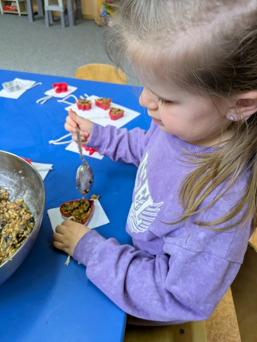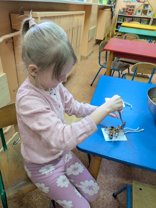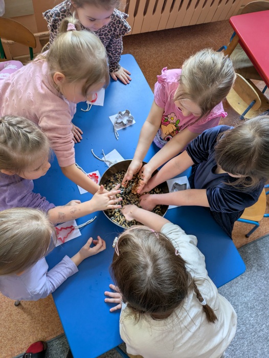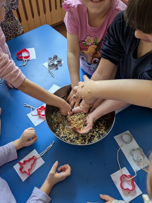 Zima to pora roku, kiedy należy pomagać zwierzętom, a zwłaszcza ptakom, przetrwać ten trudny czas. Ziemia jest zamarznięta, pokryta śniegiem lub lodem, przez co w znaczący sposób ogranicza ptakom dostęp do pokarmu. Dokarmianie ptaków staje się często jedyną szansą na przetrwanie kilku ciężkich miesięcy. Jeżyki wykazując się wielką troską o los ptaków w czasie zimy, podjęły się zadania przygotowania pokarmów dla skrzydlatych przyjaciół. Przed przystąpieniem do pracy utrwaliły nazwy ptaków, które pozostają u nas na zimę. Nauczyli się, jak mądrze dokarmiać skrzydlatych przyjaciół oraz zdobyli wiedzę, jakie ziarna są przysmakiem dzikich ptaków. Na koniec wykonaliśmy galaretkowe zawieszki dla ptaków.